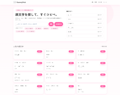 かわいい・泣く・驚きなど日本語キーワードで顔文字を探せる顔文字コピペサイトKaomojiHub。短い順/長い順の並べ替え、カテゴリ、シーン、五十音索引で目的の顔文字を素早く見つけてコピーできます。 KaomojiHubは日本語の顔文字を検索してコピペできるデータベースです。かわいい・泣く・驚きなど感情別に整理し、短い順/長い順の並べ替えや五十音索引で探しやすくしています。LINEやSNSですぐ使える顔文字が見つかります。