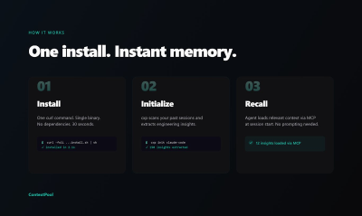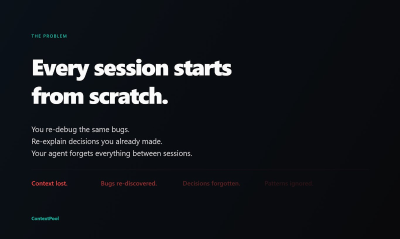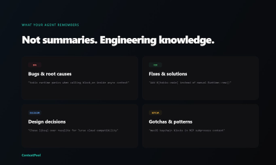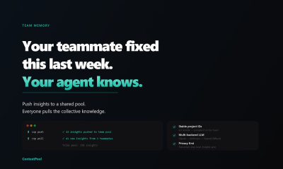 Every AI coding session often begins with redundant effort: you find yourself re-debugging familiar issues, re-explaining previously made decisions, and constantly battling an AI agent that loses context. ContextPool solves this fundamental challenge by endowing your AI agent with persistent, long-term memory. It intelligently scans your past Cursor and Claude Code sessions, meticulously extracting vital engineering insights such as identified bugs, successful fixes, critical design decisions, and common pitfalls. This relevant context is then automatically loaded via MCP at the start of each new session, requiring no manual prompting. ContextPool seamlessly integrates with Claude Code, Cursor, Windsurf, and Kiro. It is available as a free and open-source solution, with advanced team synchronization features offered at just $7.99 per month.