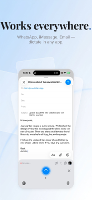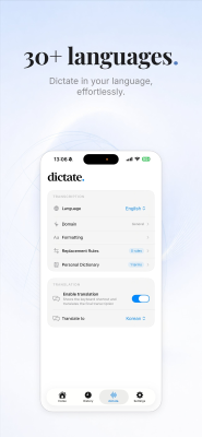 dictate. transforms your iOS typing experience with an advanced AI voice dictation custom keyboard. Simply tap the microphone icon, speak naturally, and watch your words instantly appear as text in Messages, WhatsApp, Mail, Notes, or any other application. Key features include universal compatibility across all apps via its custom keyboard, support for over 30 languages, real-time translation between different languages, intelligent AI formatting and punctuation, and a stringent privacy-first approach where all audio is deleted immediately after transcription. Enjoy 70 free transcriptions per week, with a Pro subscription unlocking unlimited usage for seamless communication.