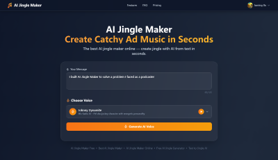 AI Jingle Maker transforms text into broadcast-quality radio jingles, commercial audio ads, podcast intros, and DJ drops. Pick an AI voice and background music, the system automatically mixes and exports a ready-to-use audio file (MP3; DJ drops also support MP3/WAV). Generation typically takes about 10–30 seconds, and commercial usage rights are included. Pricing is credit-based with one-time purchases (no subscription) and credits that never expire.
