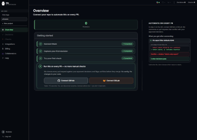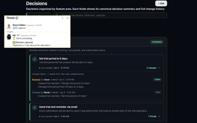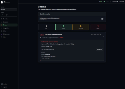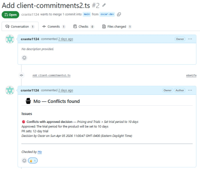Prevent costly regressions and ensure alignment between team decisions and deployed code with Mo. It's a common scenario: a critical agreement made in Slack is inadvertently broken by a pull request, often discovered too late in QA or even post-deployment. Mo proactively monitors your designated Slack channels for critical decisions. When a team member tags @mo for approval, the decision is securely stored. Subsequently, upon a pull request opening, Mo intelligently compares the code diff against all approved decisions, flagging any conflicts before the merge, safeguarding your codebase against unintentional deviations. Mo's focus is solely on enforcing team consensus, not code quality, ensuring your development truly reflects agreed-upon specifications.