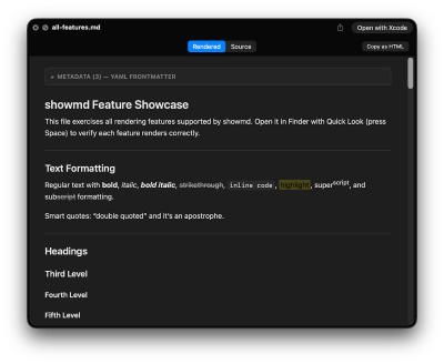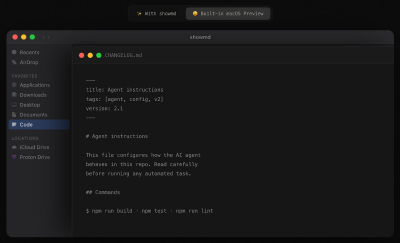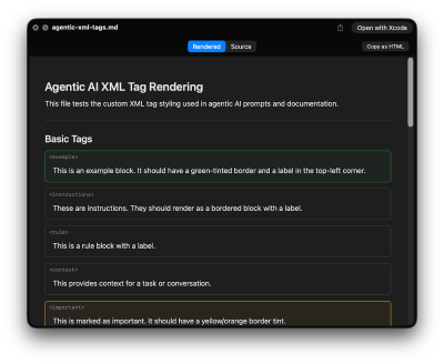Have you ever wondered why essential SKILL.md files and other Markdown documents render as plain text within MacOS Preview, obscuring their intended formatting? showmd is a complimentary, native macOS Quick Look extension meticulously engineered to render Markdown files beautifully and accurately. It intelligently parses YAML frontmatter, presenting it within a convenient, collapsible metadata table that is collapsed by default and expands with a single click. Uniquely, showmd goes beyond standard viewers by rendering Agentic AI XML tags, along with 17 other specialized tags, as clearly labeled, bordered blocks instead of displaying raw, unformatted angle brackets. This ensures superior readability and understanding for complex technical documentation.