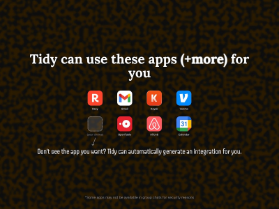 Tidy is an innovative personal AI agent engineered to seamlessly integrate with your digital life, capable of utilizing any application or website you interact with, effectively performing virtually any task you do. Tidy maintains constant communication and keeps you informed via iMessage, complemented by a persistent filesystem for reliable data management. Similar to OpenClaw but entirely cloud-hosted, Tidy empowers you to safely teach it to navigate and use any website without requiring a single line of code. Now, Tidy extends its capabilities to group iMessage chats, enabling collaborative assistance and enhanced productivity for teams and shared projects.